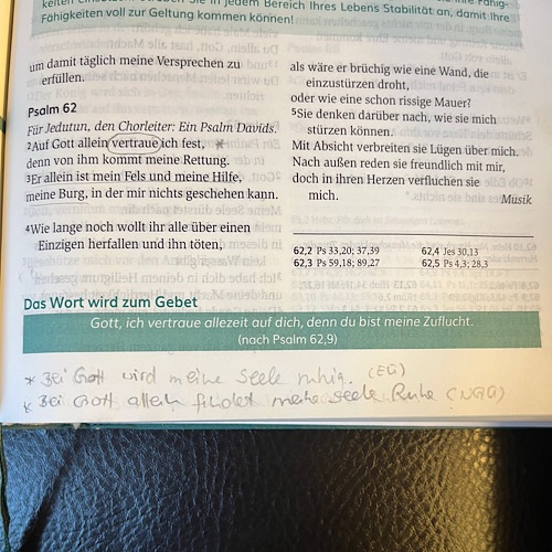 Danach nehme ich mir noch Zeit einen Psalm zu lesen und zu beten. In einen Vers, der mich anspricht tauche ich etwas tiefer ein. „Gott allein vertraue ich“, steht in der Übersetzung „Neues Leben“, die ich vor mir liegen habe. Ich blättere in anderen Übersetzungen und lese: „Bei Gott allein findet meine Seele Ruhe.“ Das Bild spricht mich an: Eine Seele die Ruhe findet, indem sie Gott vertraut. Genau das wünsche ich mir, dass brauche ich gerade, ich stelle es mir vor, spreche es meiner Seele zu und bitte Gott darum.