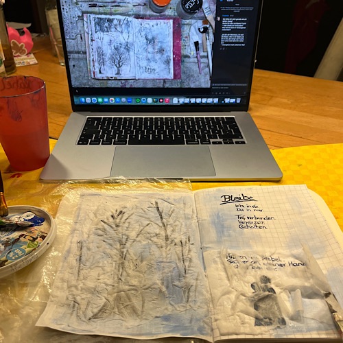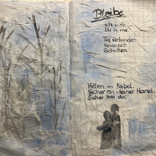 Später geht es mir wieder gut genug, dass ich sitzend kreativ sein kann. Einmal im Monat treffe ich mich online mit anderen Frauen im Kreativ-Raum von Friederike. Heute ist das Thema der Bibelvers: „Ich bin der Weinstock und ihr seid die Reben. Wer in mir BLEIBT…“ aus Johannes 15,5 verbunden mit der Frage, wie wir im Nebel bei Jesus bleiben, was das für uns bedeutet und was das in uns bewirkt. Das Thema passt sehr zu dem, was mich schon im Januar beschäftigt hat. (In meinem Monatsrückblick nehme ich dich ein bisschen mit hinein.)
